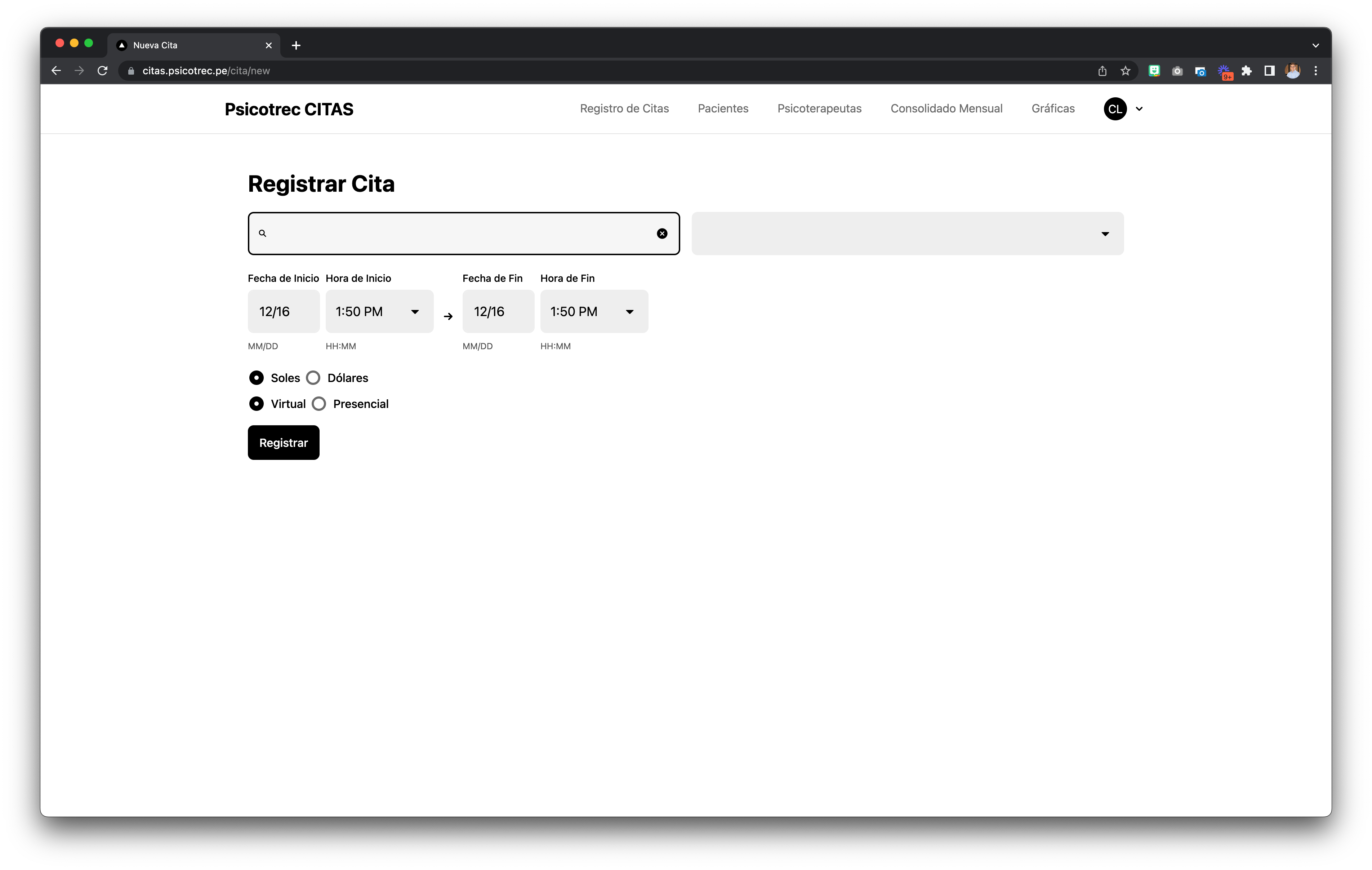 After clicking "Nueva Cita" (register a new session [in english]), we end up on the following screen. The A.S. search for a specific client by name and associates him with a psychotherapist with the details of the session.