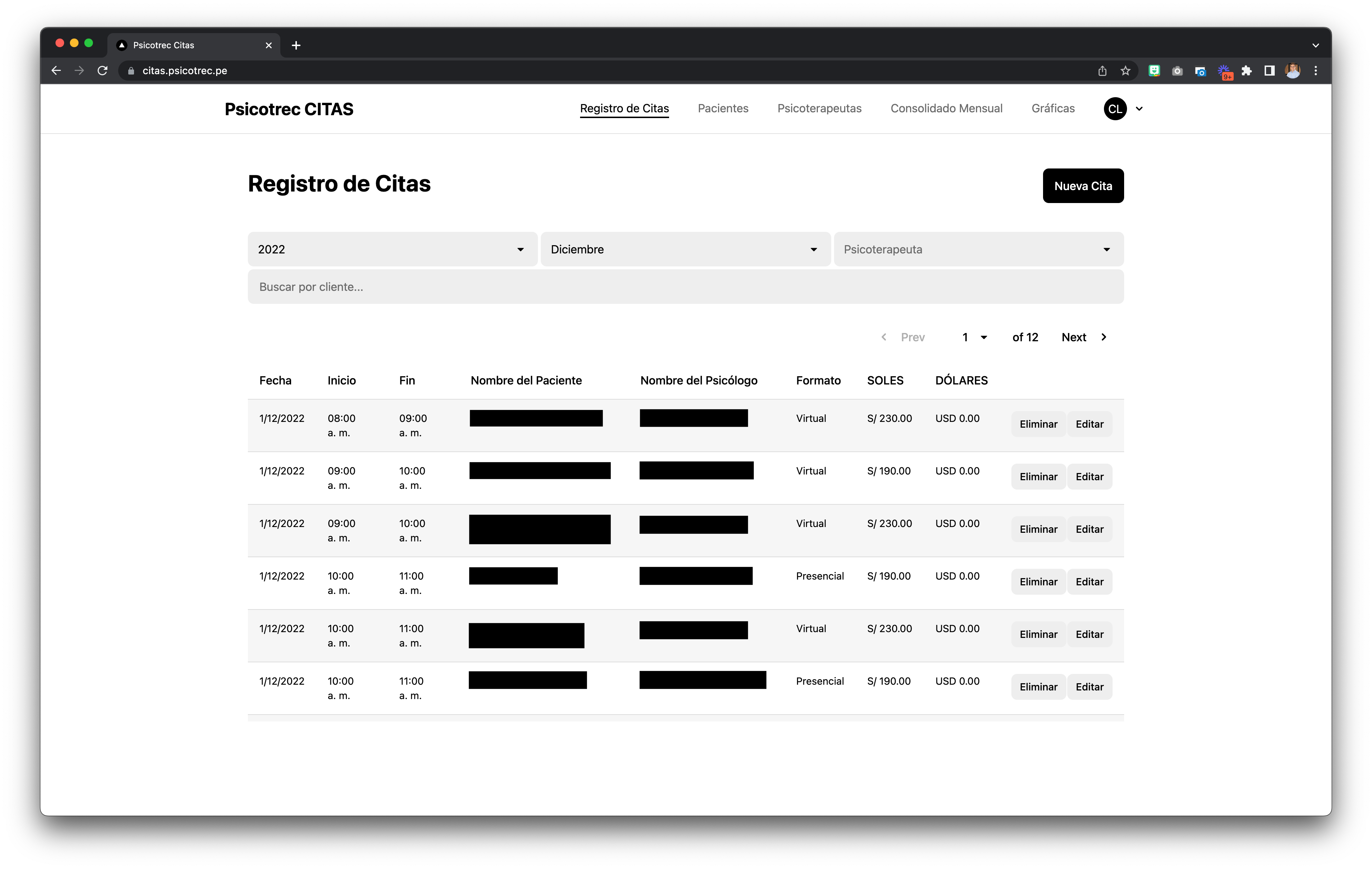 The following image shows us all sessions registered for a determined month. The A.S. can filter the data via a psychotherapist or search for a specific client.