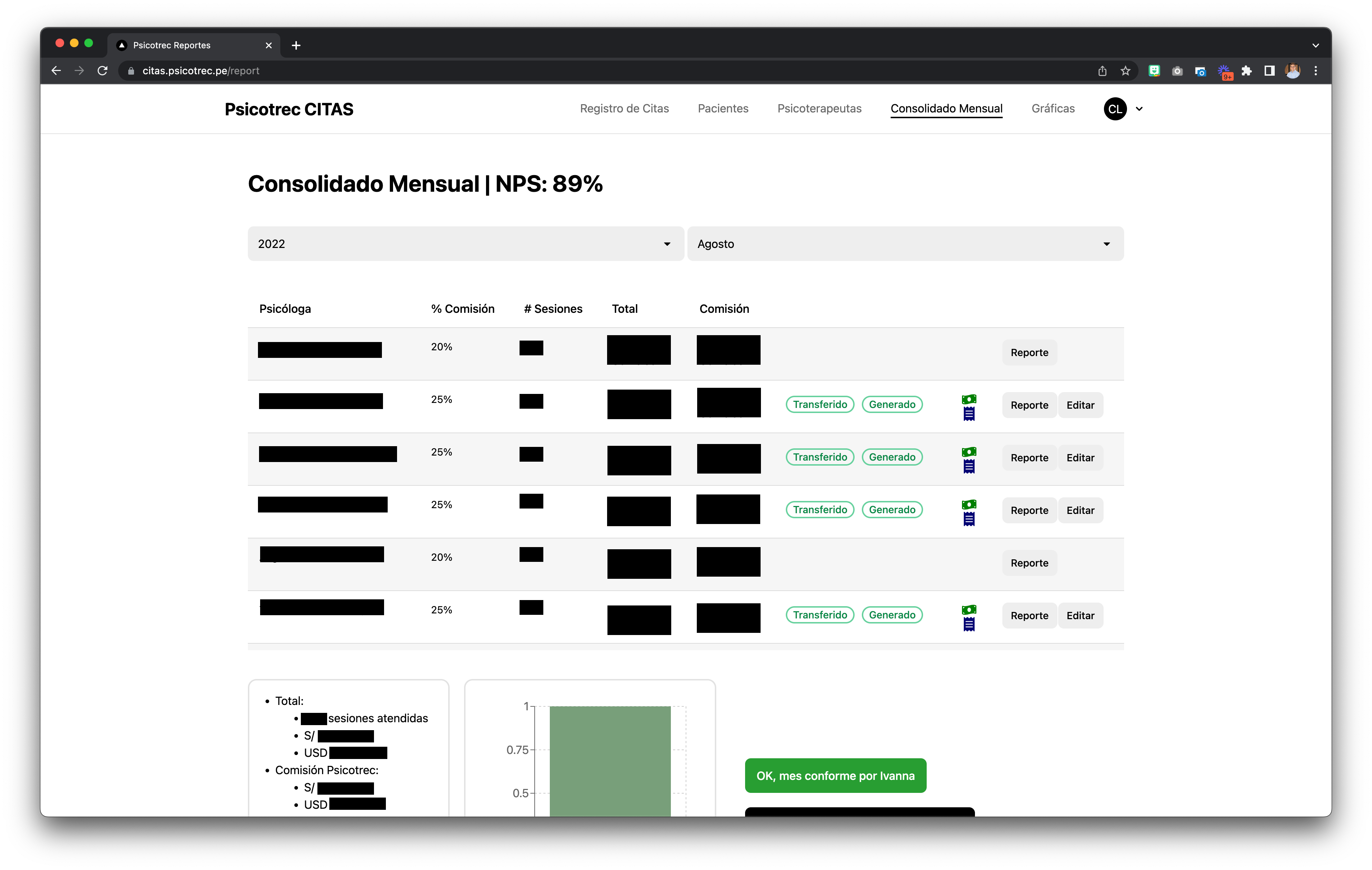 Psicotrec has +500 therapy sessions monthly, with a staff of more than ten psychotherapists. At the end of the month, the administrative team consolidates all session and generate a detailed report for each psychotherapist. This report contains session information and commission rate per psychotherapist.